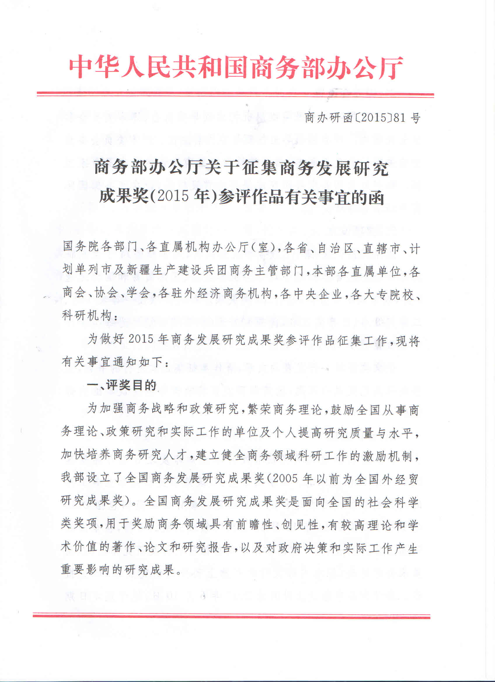 商务部办公厅关于征集商务发展研究成果奖(2015年)参评作品有关事宜的函-01.jpg