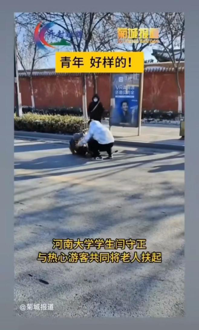 “孩儿,没事儿,你让我坐在地上就行,别压疼你。”老人热泪盈眶地说。12月24日,哲学与公共管理学院2022级研究生闫守正在天波杨府门口等车返校时,一位老人在对面站台等车时不慎跌落摔倒在快车道,闫守正迅速冲到老人身边,与热心游客共同将老人扶到路边坐下。为了防止老人受凉,他将自己的脚垫在老人身下,并及时拨打110。直到民警将老人送回家后,闫守正才放心离开。路过的群众对此纷纷竖起大拇指,“咦,这个孩真管!”“真是个热心好青年!”“嗯,河大的学生真不孬!”事后,开封市广播电视台在官方抖音号菊城报道中对其事迹进行了报道,受到了社会各界的广泛赞扬。