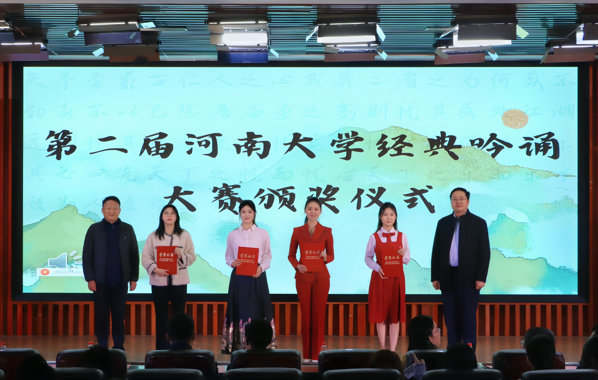 为深入学习贯彻习近平文化思想,传承发扬中华优秀传统文化,展现新时代青年精神风貌,11月23日下午,由河南大学党委宣传部、河南大学党委学生工作部、河南大学党委研究生工作部主办,河南大学哲学与公共管理学院、河南大学洛学与宋学研究中心共同承办的第二届河南大学经典吟诵大赛现场展演暨颁奖仪式在生命科学学院三楼报告厅举行。校团委书记龚森、党委宣传部副部长陈旭、党委学生工作部副部长李平、党委研究生工作部副部长吴坤、我院党委书记党鸿军、副院长田丰韶,洛学与宋学研究中心赵清文、冯鹏参加了活动。
